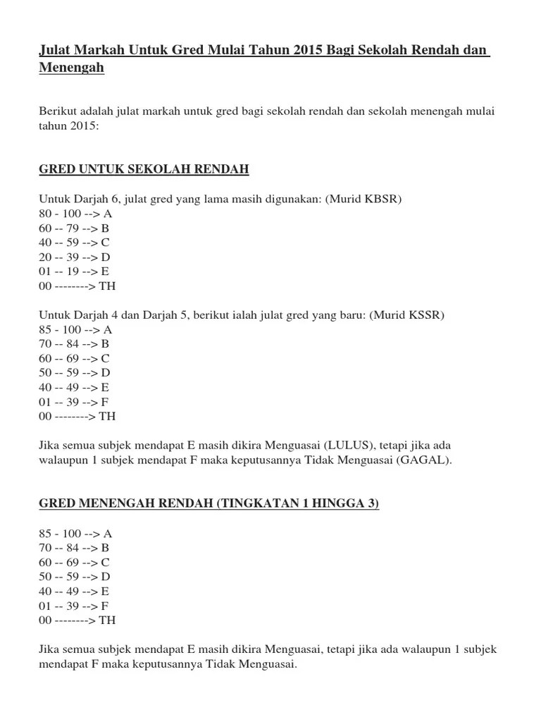 Juga dikongsikan gred pemarkahan lama dengan yang baru untuk sekolah rendah, menengah rendah dan menengah atas sebagai rujukan dan perbandingan. Gred menengah rendah (mr) 2016 . Sistem gred pemarkahan terkini upsr pt3 spm 2018 sistem pemarkahan peperiksaan upsr pt3 spm terkini 2018 gred pemarkahan sekolah rendah gred . Berikut adalah perbezaan gred pemarkahan lama dengan yang baru untuk sekolah rendah, menengah rendah dan menengah atas yang boleh dijadikan. Untuk makluman anda, semakan keputusan peperiksaan sekolah rendah dan sekolah menengah boleh dibuat secara online melalui sistem saps nkra. 2, senarai sekolah rendah dan menengah mengikut negeri (31 mei 2019). Senarai sekolah rendah dan menengah mengikut negeri 31 . Gred spm 2022 terkini julat dan skema markah dan penentuan pemarkahan sekolah menengah rendah dan atas oleh kpm & lpm bagi pelajar tingkatan . 1, senarai sekolah rendah dan menengah mengikut negeri (jan 2020). Dalam pada masa yang sama kementerian pendidikan malaysia kpm telah melakukan semakan. Berikut adalah perbezaan gred pemarkahan lama dengan yang baru untuk sekolah rendah, menengah rendah dan menengah atas yang boleh dijadikan rujukan untuk .